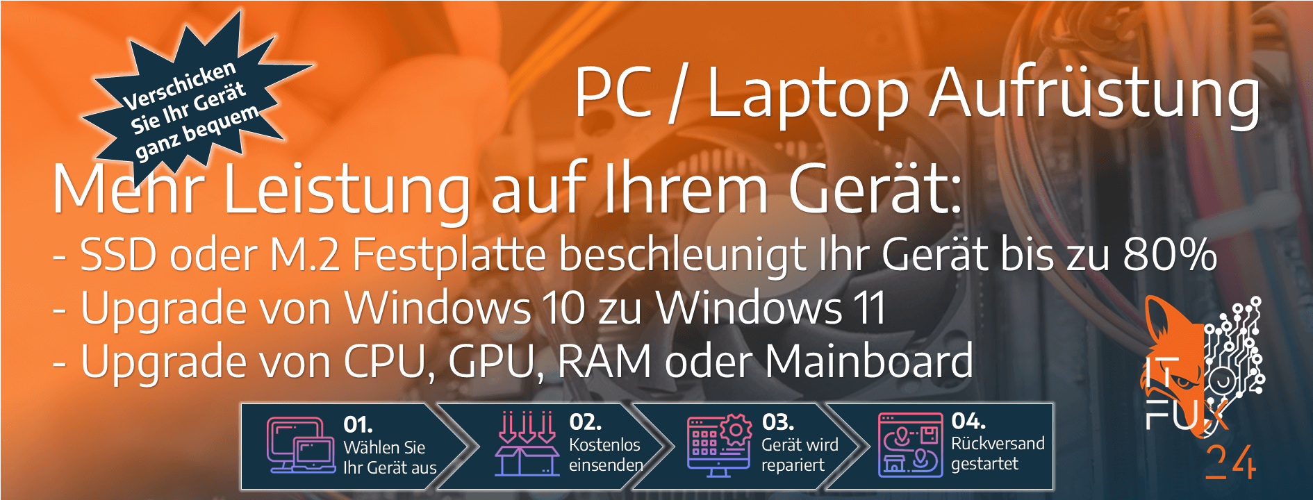 Sie können die Leistung Ihres Laptops oder PCs von schlecht bis sehr gut verbessern. Ganz gleich, ob es sich um das Hinzufügen von mehr Arbeitsspeicher, das Austauschen von Batterien oder Festplatte handelt, Wir sind sofort für Sie da! Alles, was Sie tun müssen, ist, uns Ihren Bedarf und Ihre Bedingungen in Frankfurt am Main mitzuteilen, und Sie erhalten das beste und fairste Angebot für die PC & Laptop Aufrüstung.